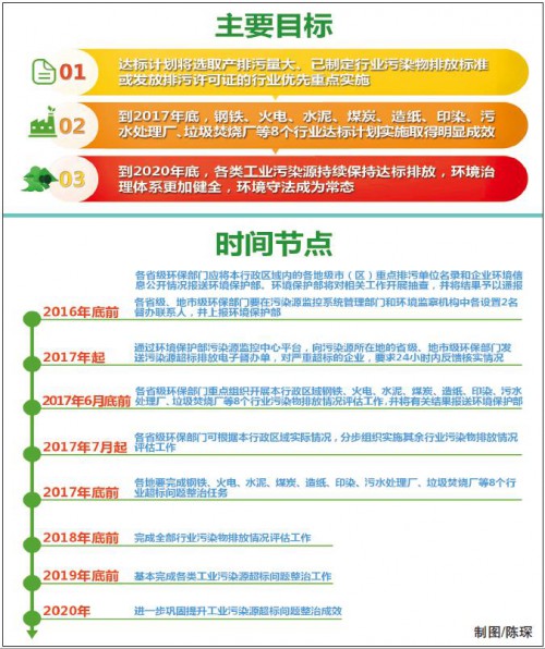 環(huán)境保護(hù)部日前發(fā)布《關(guān)于實(shí)施工業(yè)污染源全面達(dá)標(biāo)排放計(jì)劃的通知》(以下簡(jiǎn)稱(chēng)《通知》),要求到2017年底,鋼鐵、火電、水泥、煤炭、造紙、印染、污水處理廠、垃圾焚燒廠等8個(gè)行業(yè)達(dá)標(biāo)計(jì)劃實(shí)施取得明顯成效,污染物排放標(biāo)準(zhǔn)體系和環(huán)境監(jiān)管機(jī)制進(jìn)一步完善,環(huán)境守法良好氛圍基本形成。到2020年底,各類(lèi)工業(yè)污染源持續(xù)保持達(dá)標(biāo)排放,環(huán)境治理體系更加健全,環(huán)境守法成為常態(tài)。