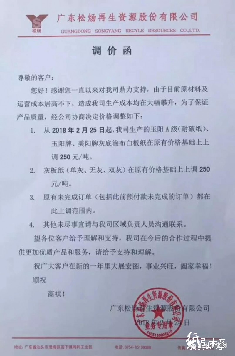 從2018年2月26日起提高我公司生產(chǎn)的各種等級(jí)涂布灰底白板紙的銷(xiāo)售價(jià)格。