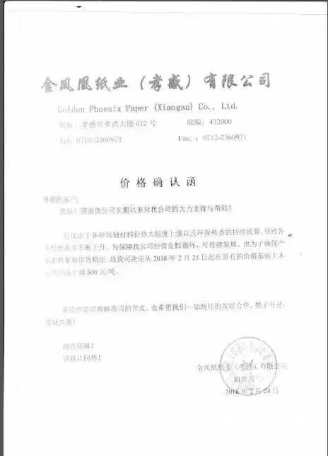 從2018年2月26日起,山東江河生產(chǎn)的無(wú)碳原紙,在現(xiàn)執(zhí)行價(jià)格基礎(chǔ)上調(diào)300元/噸。