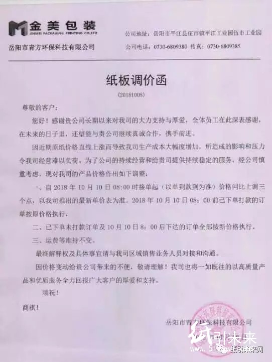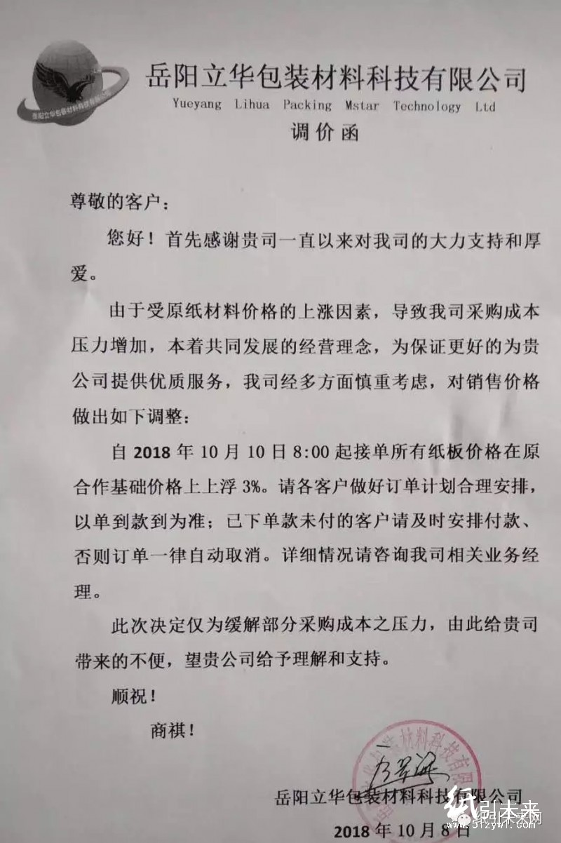 岳陽市立華包裝材料科技有限公司:自2018年10月10日接單起,所有紙板價格在原合作基礎(chǔ)上上浮3%。