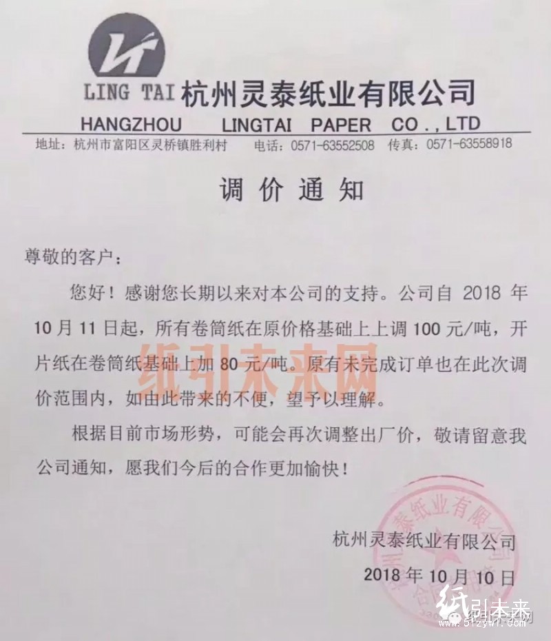 杭州靈泰紙業(yè)有限公司:自2018年10月11日起,所有卷筒紙在原價格基礎(chǔ)上上調(diào)100元/噸,開片紙在卷筒紙基礎(chǔ)上加80元/噸。
