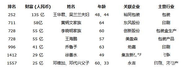 在印刷包裝行業(yè)中,主營行業(yè)與紙相關(guān)的企業(yè)家共有7人(家族)。其中裕同包裝的王華君、吳蘭蘭夫婦排名第一,財富達到135億元,在百富榜中排名第252位。隨后的是東風(fēng)股份的黃炳文家族,創(chuàng)新股份的李曉明家族和美盈森王海鵬,他們的財富都超過了50億元。