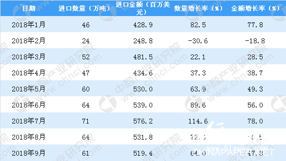 2018年1-9月中國紙及紙板進(jìn)口數(shù)量及金額增長率情況