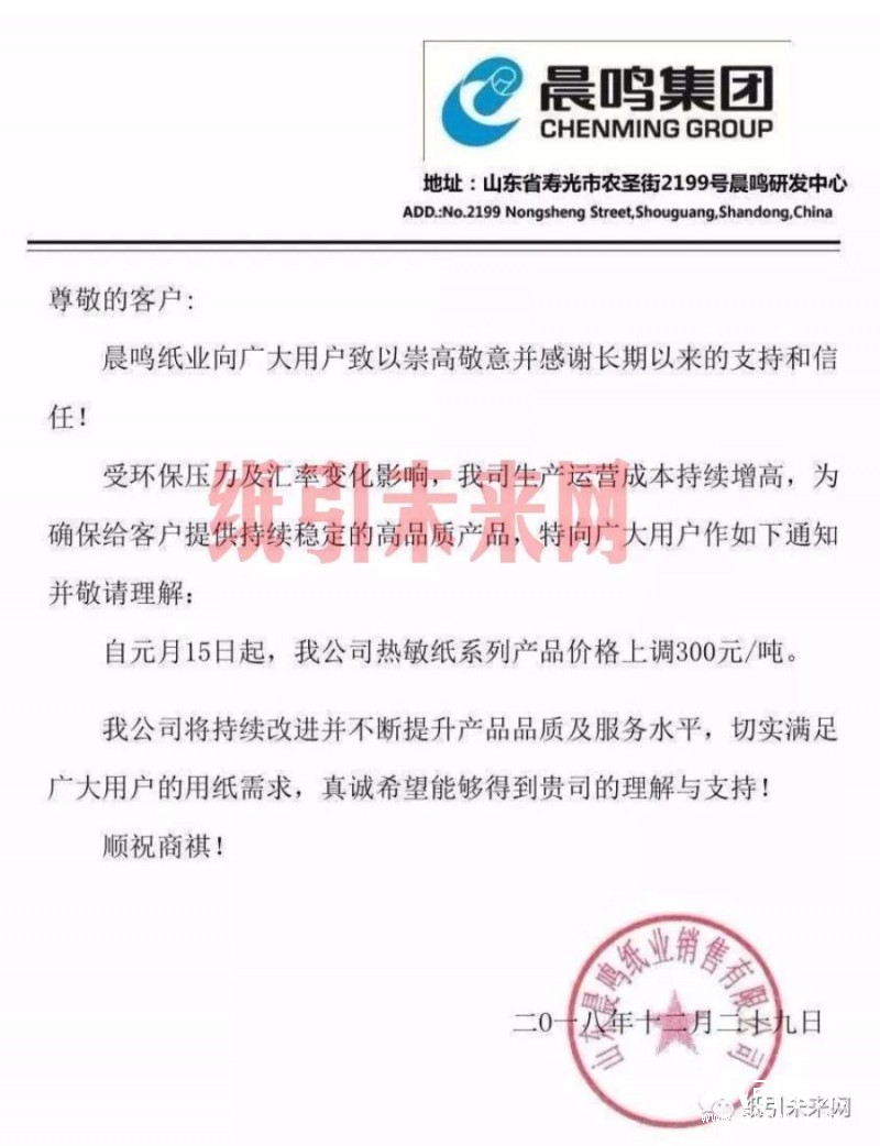 山東晨鳴紙業(yè)銷售有限公司:受環(huán)保壓力及匯率變化影響,自元月15日起,我公司熱敏紙系列產(chǎn)品價格上調(diào)300元/噸。