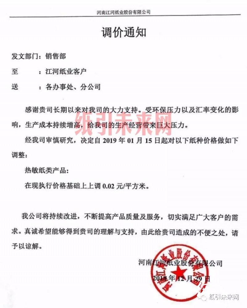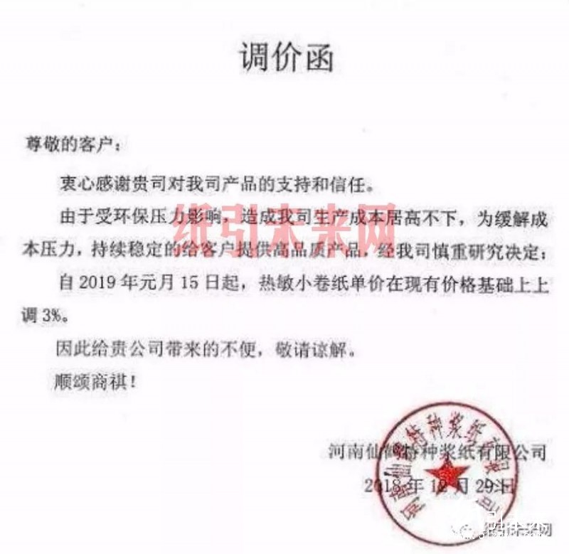 河南仙鶴特種漿紙有限公司:由于受環(huán)保壓力影響,造成我司生產(chǎn)成本居高不下,自2019年元月15日起,熱敏紙小卷紙單價在現(xiàn)有價格基礎(chǔ)上上調(diào)3%。