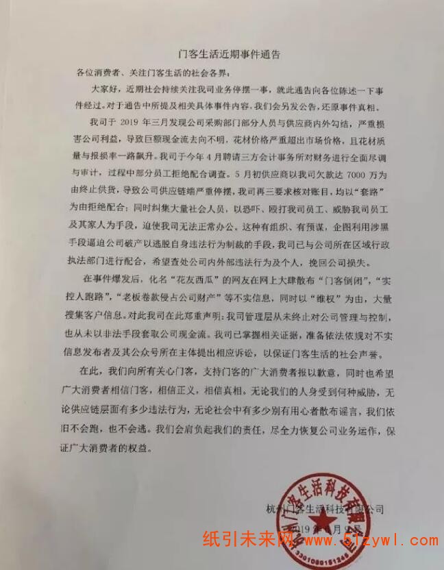根據(jù)農(nóng)衛(wèi)士的消息,近期,來(lái)自全國(guó)各地的幾十家鮮花和輔材供應(yīng)商來(lái)到杭州,討要他們被門(mén)客生活拖欠的貨款。門(mén)客生活的輔材供應(yīng)商范先生表示,他從2018年6月開(kāi)始為門(mén)客生活提供鮮花包裝中的吸水棉,但到了2019年3月,門(mén)客生活就開(kāi)始拖欠貨款。