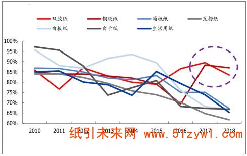 銅版紙產(chǎn)能自2012年持續(xù)下降,2018年產(chǎn)能未增長。2018年晨鳴投放100萬噸雙膠紙產(chǎn)能,其他上市紙企無新增雙膠紙產(chǎn)能,2018年雙膠紙產(chǎn)能凈增55萬噸至1031萬噸。根據(jù)當前大型紙廠擴建計劃,2019年沒有新增雙膠銅版紙產(chǎn)能。