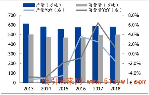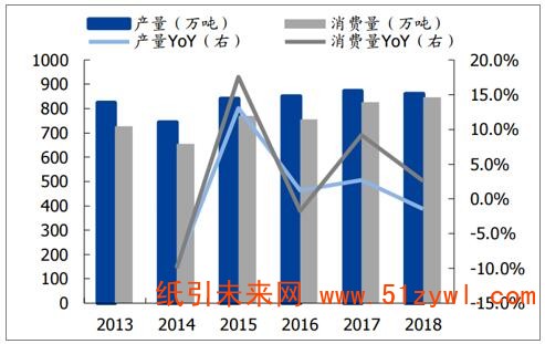 雙膠紙產(chǎn)量、消費量及同比增速