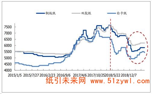 經(jīng)歷2017H2~2018H1造紙行業(yè)過熱周期,中間環(huán)節(jié)庫存處于高位。2018年4月白卡紙價格戰(zhàn)開始,白卡紙首先開始降價,木漿系銅板雙膠紙價格聯(lián)動性下跌,并且在高庫存壓力下,行業(yè)被動進入去庫周期,白卡/雙膠/銅版紙價格從2018年4月6660/7483/7500元/噸跌至2019年2月4943/6017/5533元/噸。