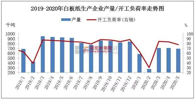 2020年1-5月份白板紙開工負(fù)荷率維持在68%左右,較去年同期下降5個百分點,且2月份因復(fù)工延后,白板紙開工負(fù)荷率僅為30%。年初富陽地區(qū)產(chǎn)能騰退150萬噸,1-5月份總產(chǎn)量較去年同期減少24.49%。紙廠庫存情況來看,截至5月底,白板紙企業(yè)庫存量較去年同期增加5.84%。白板紙產(chǎn)量大幅減少,但庫存小幅增加,需求壓力仍存。