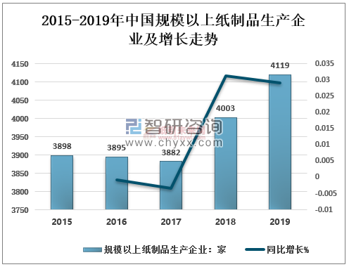 2015-2019年中國(guó)規(guī)模以上紙制品生產(chǎn)企業(yè)及增長(zhǎng)走勢(shì)