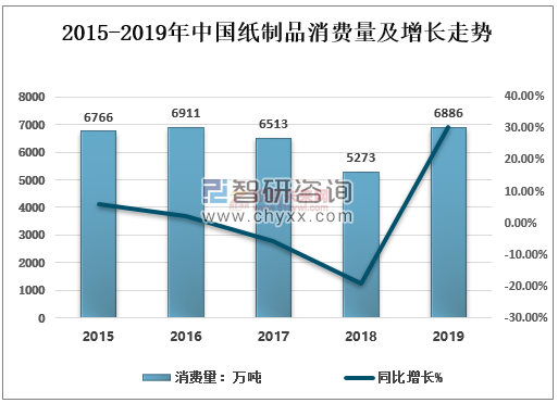 2015-2019年中國(guó)紙制品消費(fèi)量及增長(zhǎng)走勢(shì)