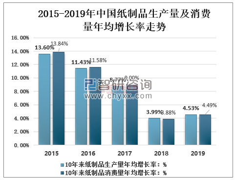 2015-2019年中國(guó)紙制品生產(chǎn)量及消費(fèi)量年均增長(zhǎng)率走勢(shì)