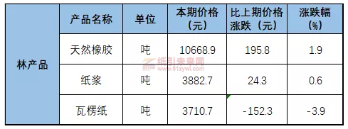 其中林產(chǎn)品領(lǐng)域,7月下旬與7月中旬相比,紙漿價(jià)格上漲24.3元,漲幅0.6%;瓦楞紙價(jià)格下跌152.3元,跌幅3.9%。
