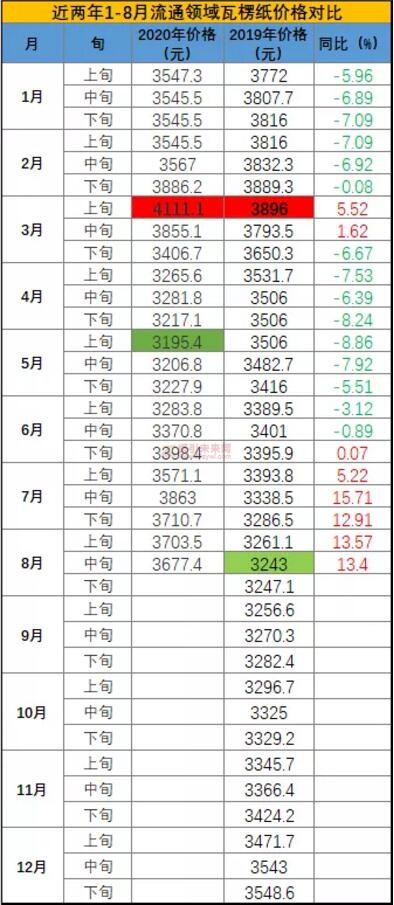2020年1月至今,瓦楞紙價格最高為3月上旬的4111.1元/噸,最低為5月上旬的3195.4元/噸,落差915.7元/噸。具體漲跌明細(xì)如下。