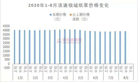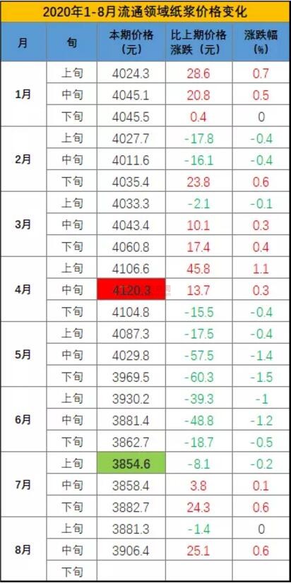 2020年1月至今,紙漿價格最高為4月中旬的4120.3元/噸,最低為7月上旬的3854.6元/噸,落差265.7元/噸。具體漲跌明細(xì)如下。