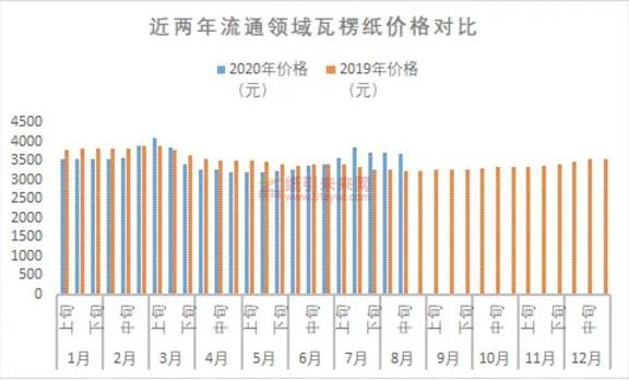 截至目前,2020年瓦楞紙價格最高值比去年最高值上漲215.1元/噸,最低值比去年最低值低47.6元/噸。