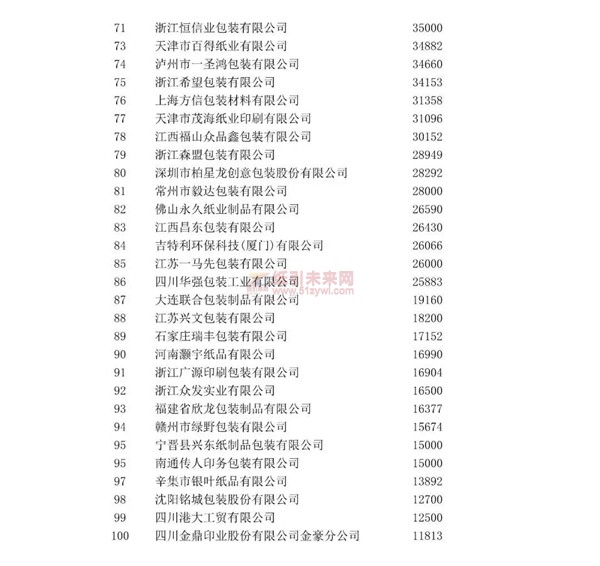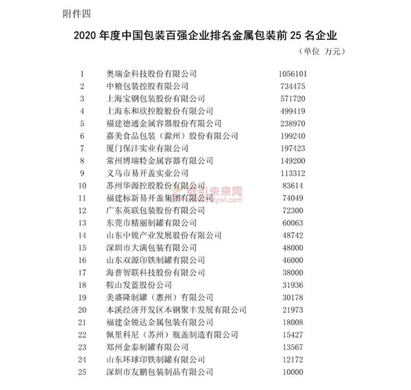 紙引未來網(wǎng)訊 10月21日,中國包裝聯(lián)合會官網(wǎng)發(fā)布了《關于2020年度中國包裝百強企業(yè)排名及行業(yè)分類排名名單的公示》。根據(jù)《關于開展包裝行業(yè)企業(yè)數(shù)據(jù)申報工作暨行業(yè)百強排名、行業(yè)分類排名活動的通知》的要求,2020年度中國包裝百強企業(yè)排名及行業(yè)分類排名活動已經(jīng)結束。本次排名活動產(chǎn)生中國包裝百強企業(yè)、紙包裝前100名企業(yè)、包裝印刷前50名企業(yè)、金屬包裝前25名企業(yè)、塑料包裝前25名企業(yè)、包裝裝備前15名企業(yè)和木包裝前10名企業(yè)。以下為具體內容: