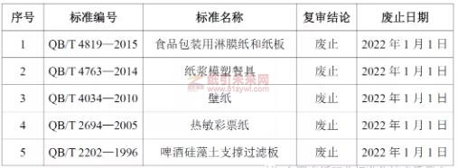 紙引未來網(wǎng)訊 根據(jù)中華人民共和國(guó)工業(yè)和信息化部公告(2020年第51號(hào)),QB/T 4819—2015《食品包裝用淋膜紙和紙板》等五項(xiàng)造紙行業(yè)標(biāo)準(zhǔn)已于2022年1月1日廢止。具體情況如下: