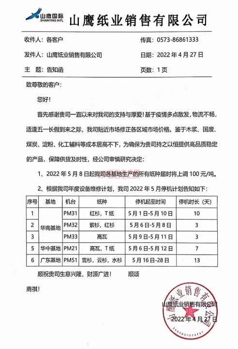 一份告知函,蘊(yùn)含漲價(jià)+停機(jī)兩項(xiàng)內(nèi)容,雖然罕見但卻并非個(gè)例。早在4月27日,山鷹國(guó)際就曾發(fā)布過一份“漲價(jià)+停機(jī)”告知函:5月8日起,各基地生產(chǎn)的所有紙種將上調(diào)100元/噸;華南、華中、廣東三大基地的5臺(tái)紙機(jī)將在5月1日-5月28日各停機(jī)3-13天。