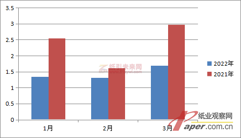 2022年1月份,銅版紙進口量1.34萬噸,同比下降47.21%,進口額1722萬美元,同比下降37.15%;2月,進口量1.31萬噸,同比下降19.02%,進口額1694萬美元,同比下降0.92%;3月,進口量1.78萬噸,同比下降40.18%,進口額2188萬美元同比下降31.26%。