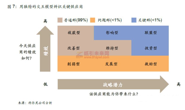 這種方法的關(guān)鍵就是將采購組織有限的資源集中到最重要的供應商身上——1%的關(guān)鍵群(聯(lián)盟型,投資型,影響型)和另外1%的問題群(削弱型,發(fā)展型,救助型)。對于問題供應商,采購組織必須對其績效進行緊密監(jiān)管;對于關(guān)鍵供應商,則必須與之密切協(xié)作,以獲得競爭性的優(yōu)勢。
