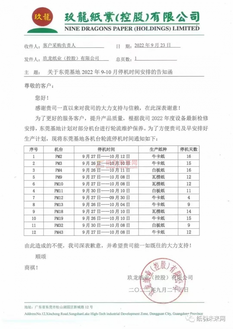 據(jù)紙引未來網(wǎng)消息,2022年9月23日東莞玖龍基地再次發(fā)布停機(jī)函,公布9月-10月停機(jī)時(shí)間安排。
