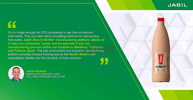 “對(duì)于CPG公司來(lái)說(shuō),說(shuō)他們已經(jīng)減少了浪費(fèi)已經(jīng)不夠了。他們現(xiàn)在還需要引人注目的解決方案來(lái)重新利用這些廢物,”捷普高級(jí)副總裁兼捷普包裝解決方案首席執(zhí)行官賈森帕拉迪諾說(shuō)。“捷普的Box-to-Bottle制造平臺(tái)使我們能夠?qū)⒖蛻舻膹U物納入我們位于加利福尼亞州曼特卡和西班牙托爾托薩的工廠的制造過(guò)程中。這個(gè)完全負(fù)責(zé)和可追溯的制造平臺(tái)為VITTEL等具有前瞻性思維的品牌提供了對(duì)其產(chǎn)品循環(huán)性的無(wú)與倫比的可見(jiàn)性。”